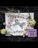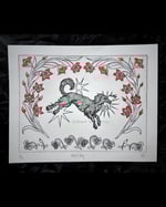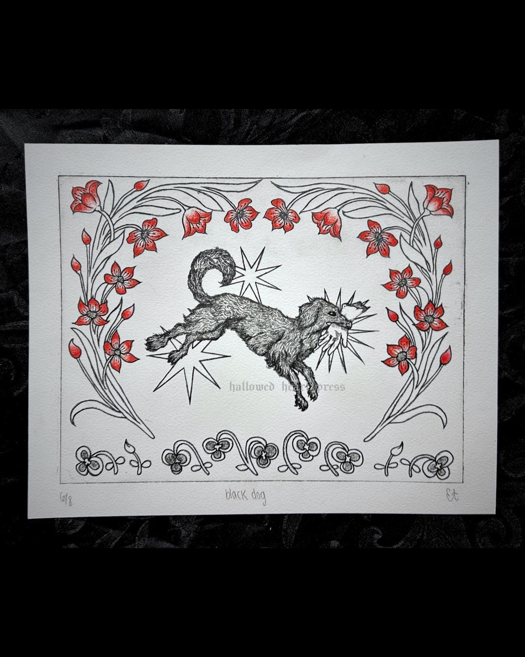 black dog with florals original design etching on bfk rives archival cotton paper with colored pencil. approx. 8in x 10in, works in a 9in x 12in frame. this item is hand-inked, hand-etched, and hand-printed! therefore, the item may vary slightly from the item pictured, but your piece will be as close to the item pictured as humanly possible. i do not accept refunds on these items due to dissatisfaction of the print. please feel free to message me with further questions <3