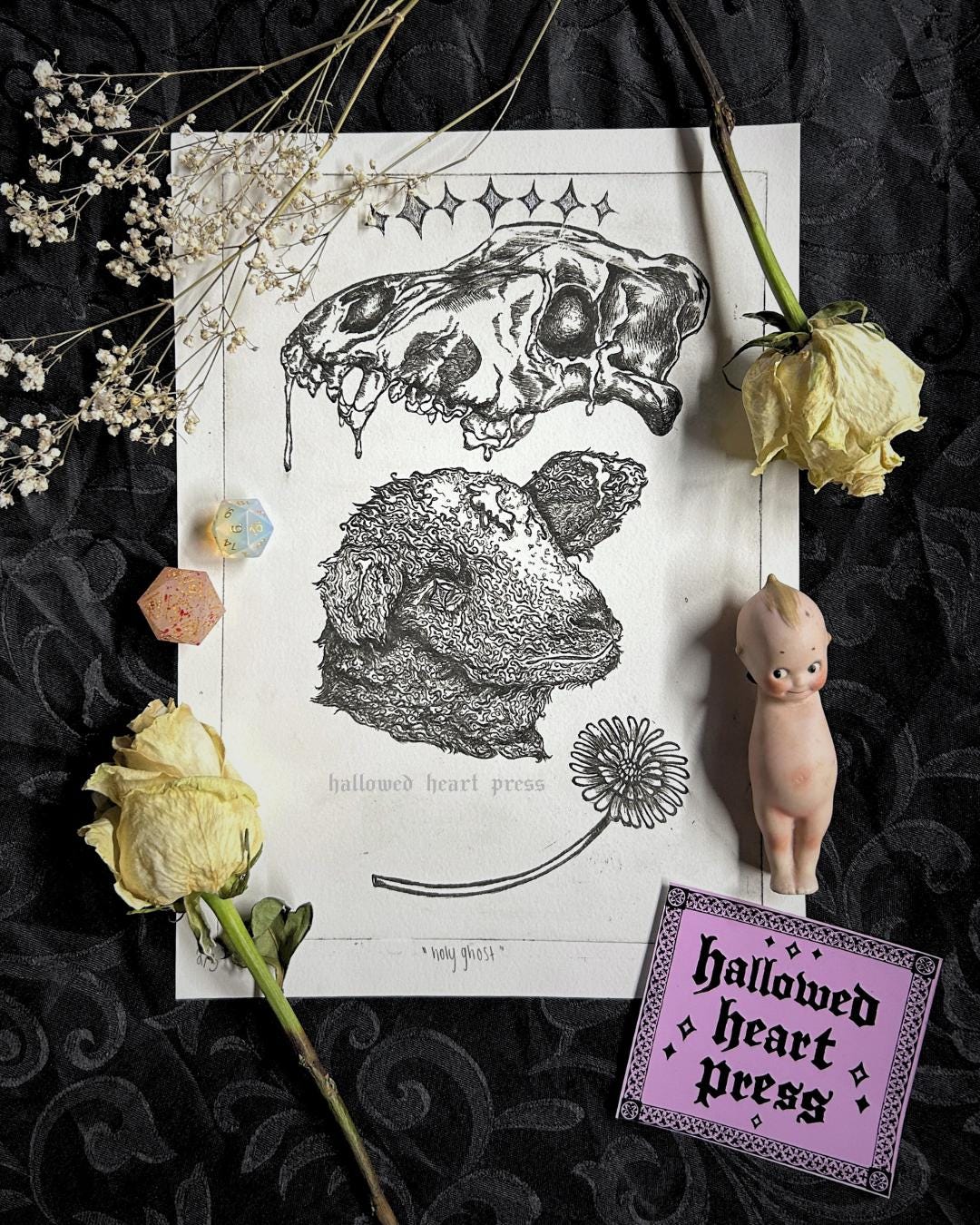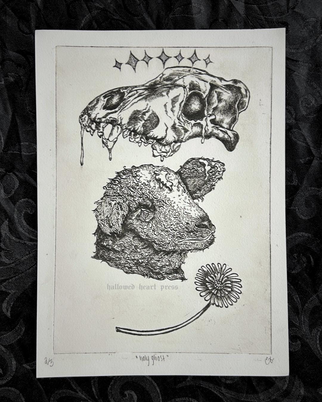 holy ghost lamb with wolf skull original design etching on bfk rives archival cotton paper. approx. 7in x 11in, works in a 9in x 12in frame. this item is hand-inked, hand-etched, and hand-printed! therefore, the item may vary slightly from the item pictured, but your piece will be as close to the item pictured as humanly possible. i do not accept refunds on these items due to dissatisfaction of the print. please feel free to message me with further questions <3