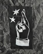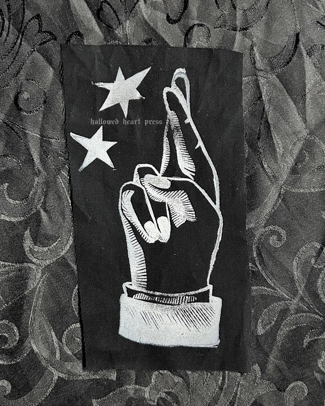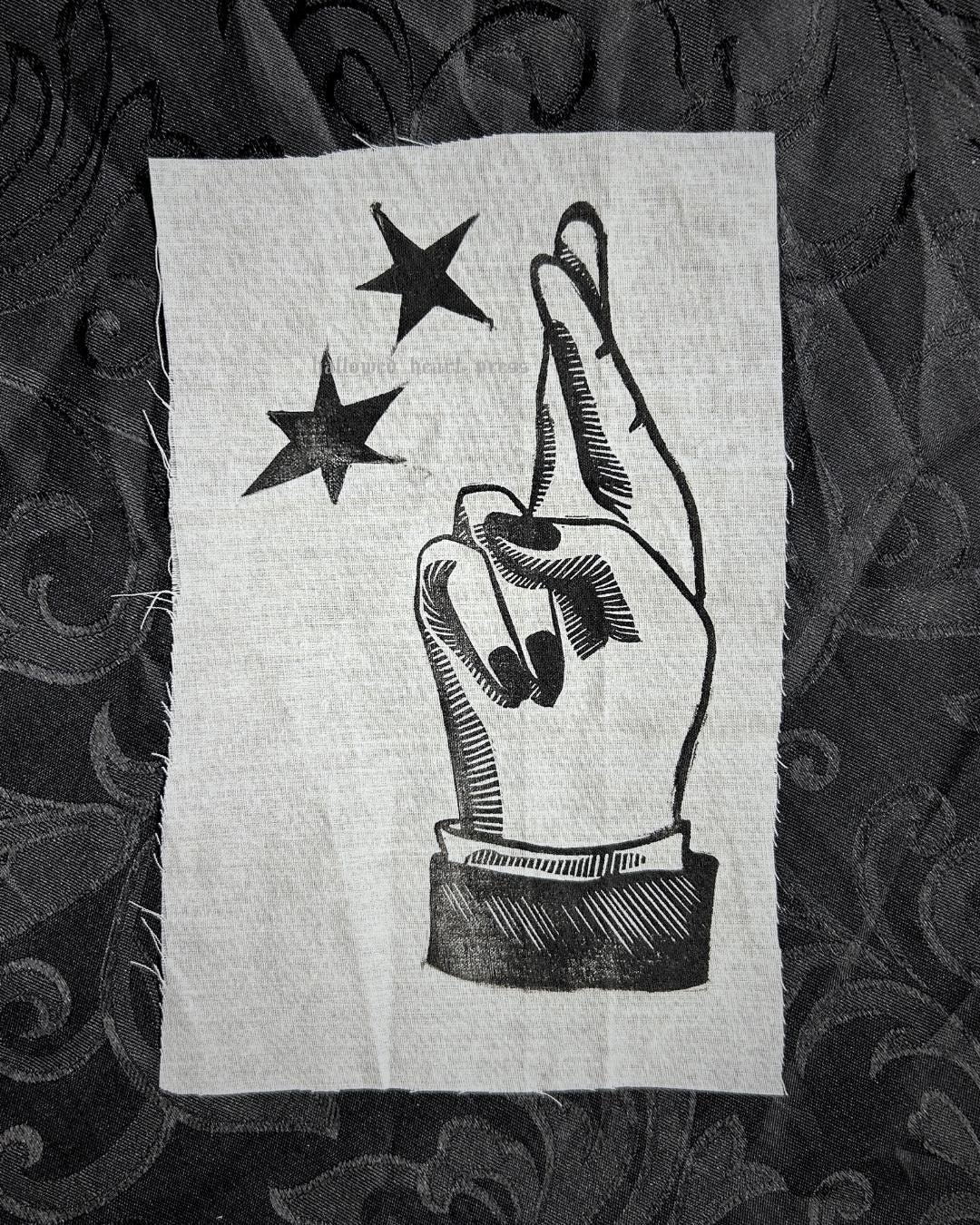 crossing your fingers original design sew-on patch on upcycled fabric. approx. 1.5in x 3in. this item is hand-inked, hand-carved, and hand-printed! therefore, the item may vary slightly from the item pictured, but your piece will be as close to the item pictured as humanly possible. i do not accept refunds on these items due to dissatisfaction of the print. please feel free to message me with further questions <3