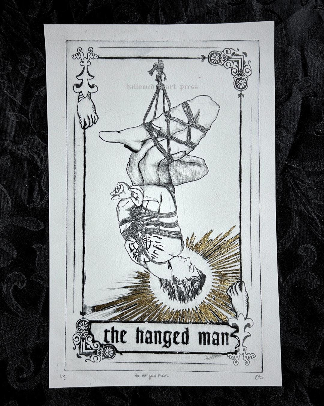 the hanged man tarot card original design etching on bfk rives archival cotton paper with gold leaf. approx. 7in x 11in, works in a 9in x 12in frame. this item is hand-inked, hand-etched, and hand-printed! therefore, the item may vary slightly from the item pictured, but your piece will be as close to the item pictured as humanly possible. i do not accept refunds on these items due to dissatisfaction of the print. please feel free to message me with further questions <3