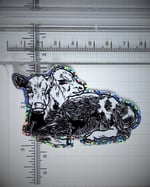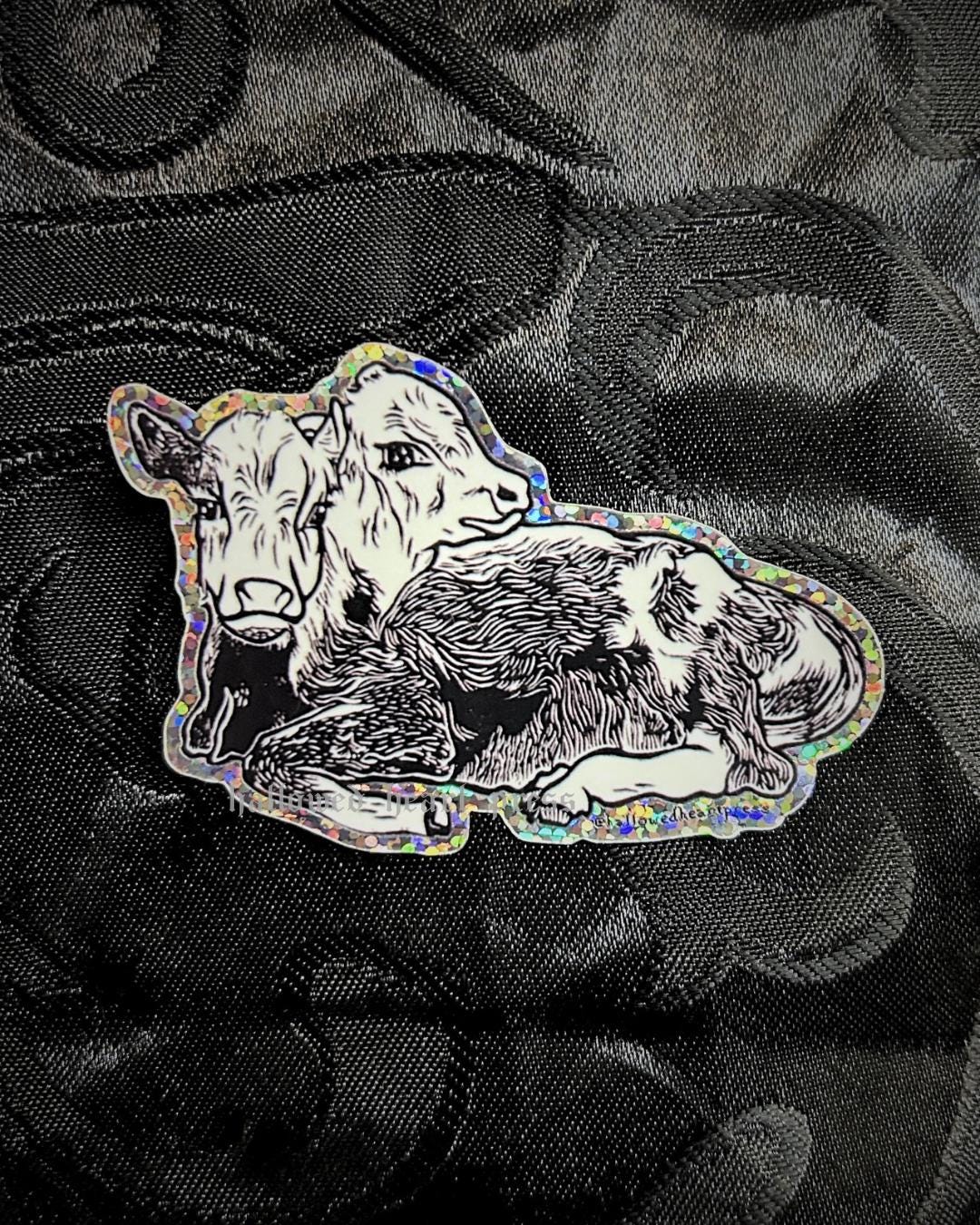 two-headed calf, cow original design sticker with a glitter background. approx 3in wide. waterproof vinyl sticker.